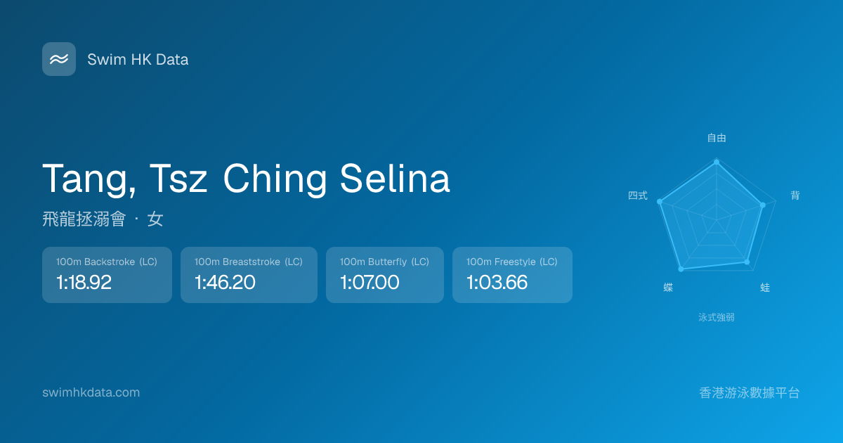 此圖表根據你所有比賽成績計算,顯示你在各泳式的相對強弱,僅供參考。繼續努力,每一次練習都會讓你更快更強!💪
