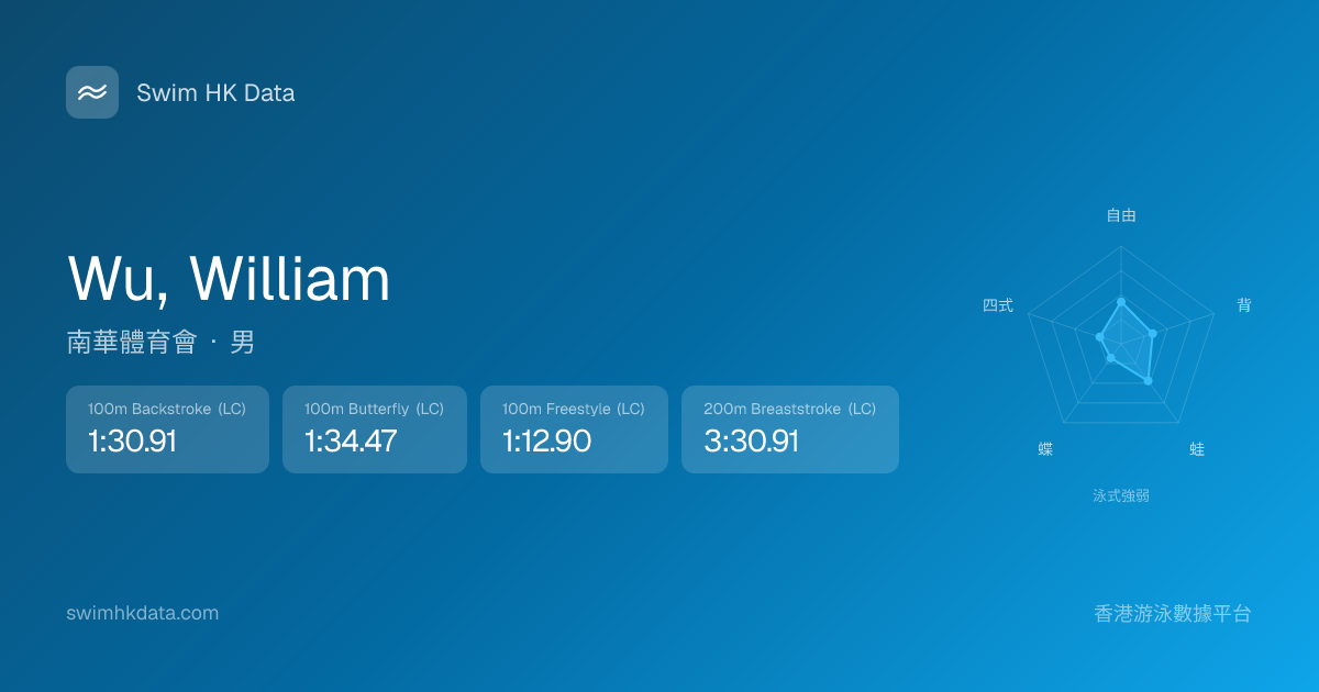 此圖表根據你所有比賽成績計算,顯示你在各泳式的相對強弱,僅供參考。繼續努力,每一次練習都會讓你更快更強!💪