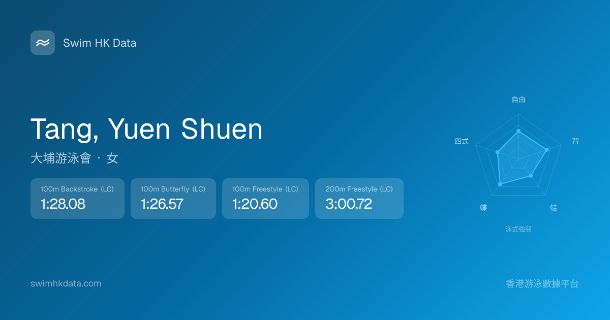 此圖表根據你所有比賽成績計算,顯示你在各泳式的相對強弱,僅供參考。繼續努力,每一次練習都會讓你更快更強!💪