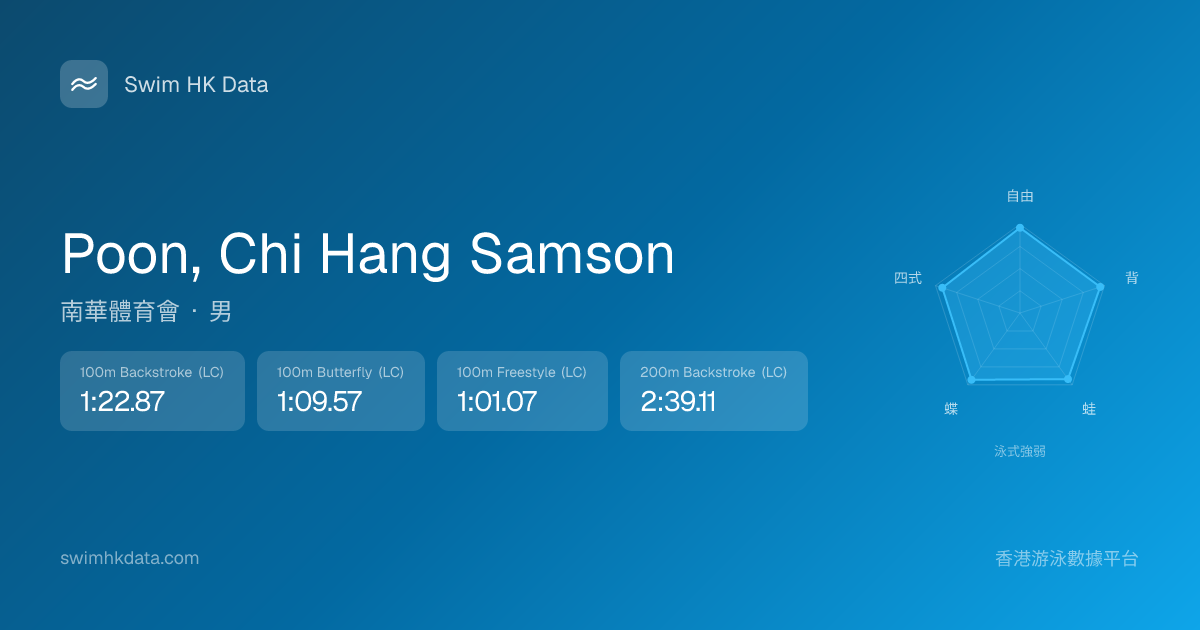 此圖表根據你所有比賽成績計算,顯示你在各泳式的相對強弱,僅供參考。繼續努力,每一次練習都會讓你更快更強!💪
