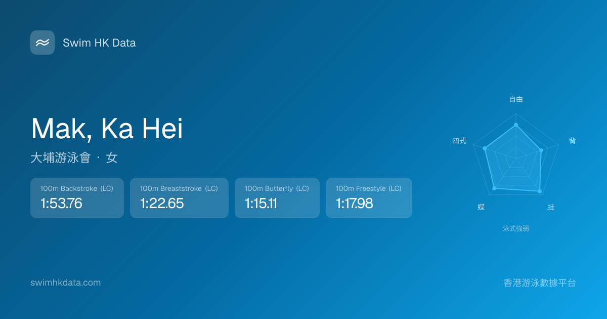 此圖表根據你所有比賽成績計算,顯示你在各泳式的相對強弱,僅供參考。繼續努力,每一次練習都會讓你更快更強!💪