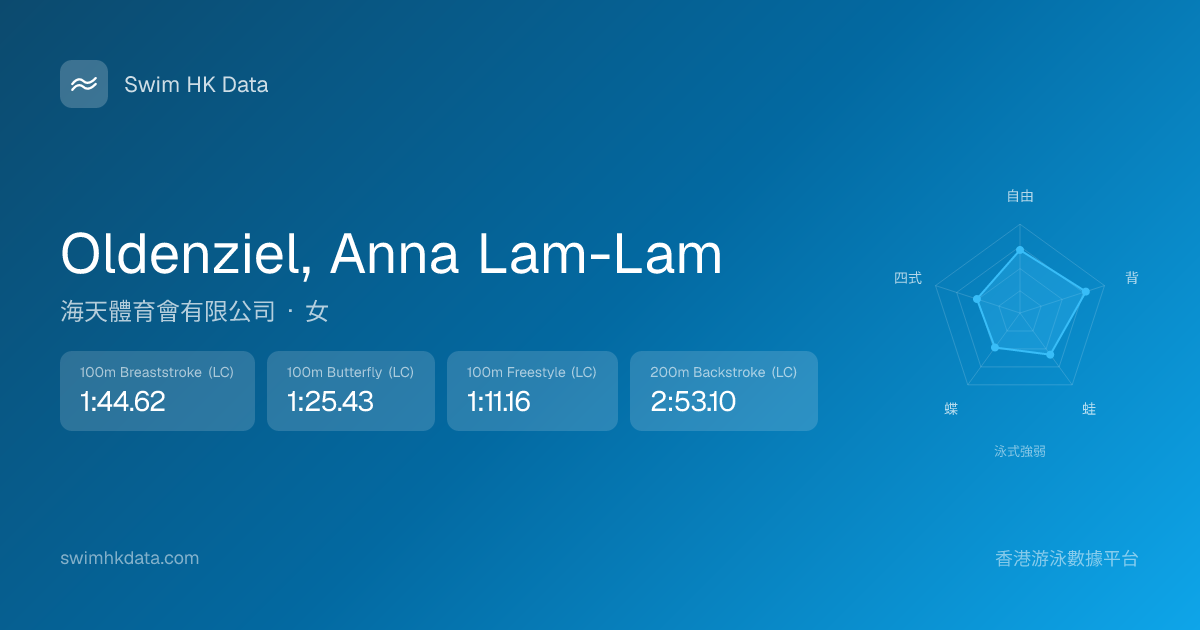 此圖表根據你所有比賽成績計算,顯示你在各泳式的相對強弱,僅供參考。繼續努力,每一次練習都會讓你更快更強!💪