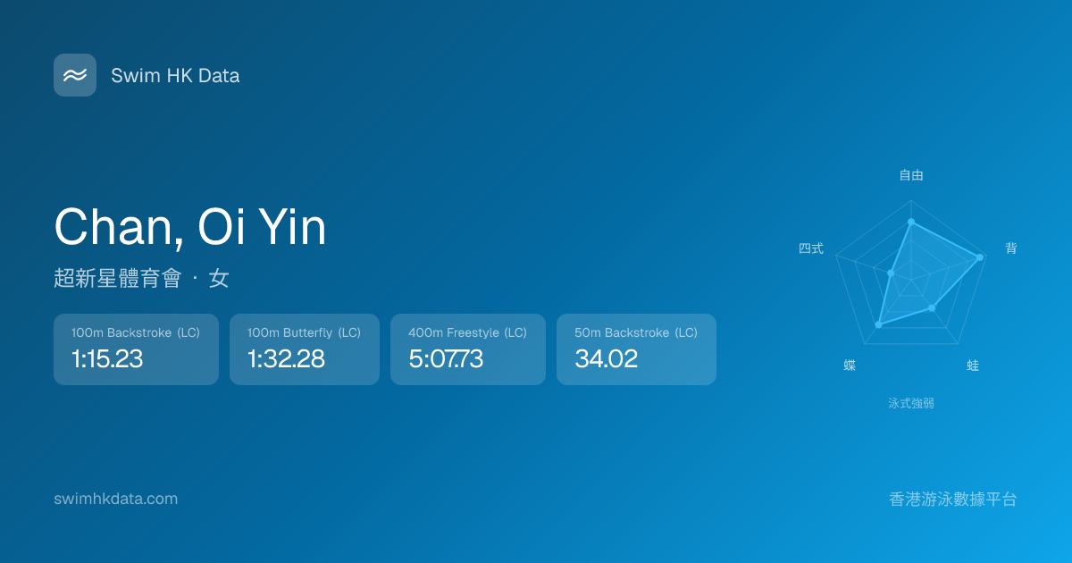 此圖表根據你所有比賽成績計算,顯示你在各泳式的相對強弱,僅供參考。繼續努力,每一次練習都會讓你更快更強!💪