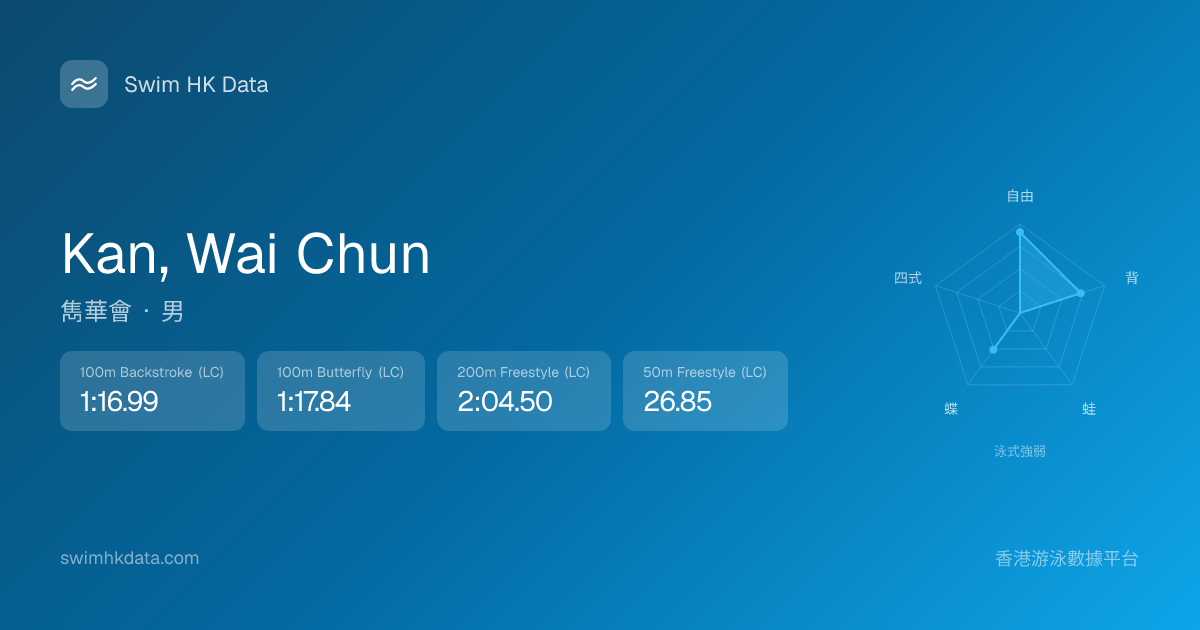 此圖表根據你所有比賽成績計算,顯示你在各泳式的相對強弱,僅供參考。繼續努力,每一次練習都會讓你更快更強!💪