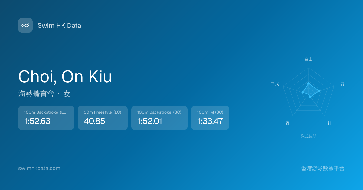 此圖表根據你所有比賽成績計算,顯示你在各泳式的相對強弱,僅供參考。繼續努力,每一次練習都會讓你更快更強!💪