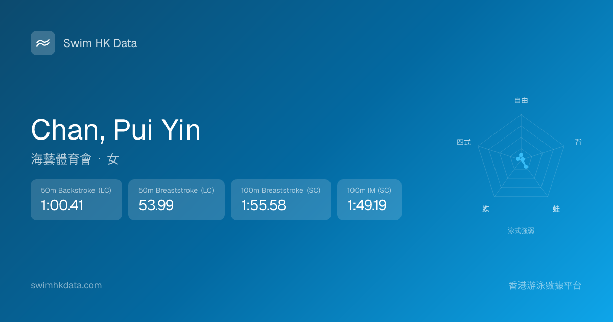 此圖表根據你所有比賽成績計算,顯示你在各泳式的相對強弱,僅供參考。繼續努力,每一次練習都會讓你更快更強!💪