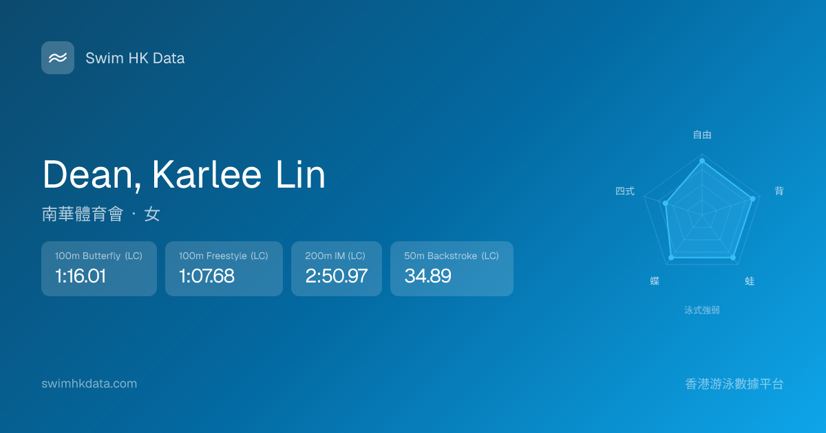 此圖表根據你所有比賽成績計算,顯示你在各泳式的相對強弱,僅供參考。繼續努力,每一次練習都會讓你更快更強!💪