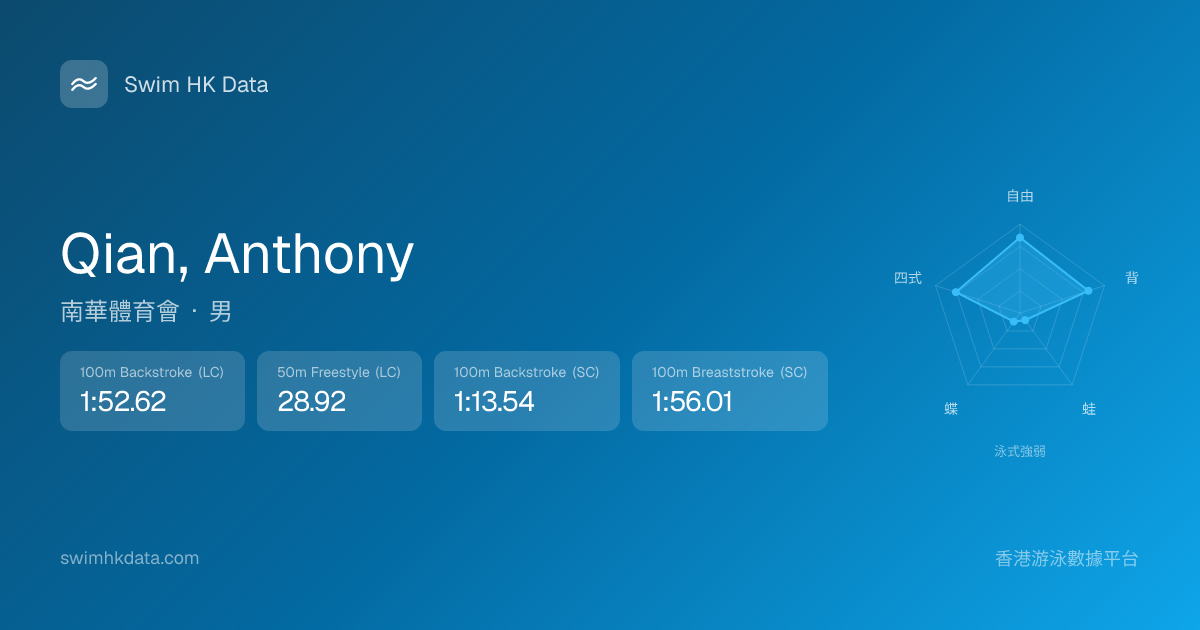 此圖表根據你所有比賽成績計算,顯示你在各泳式的相對強弱,僅供參考。繼續努力,每一次練習都會讓你更快更強!💪