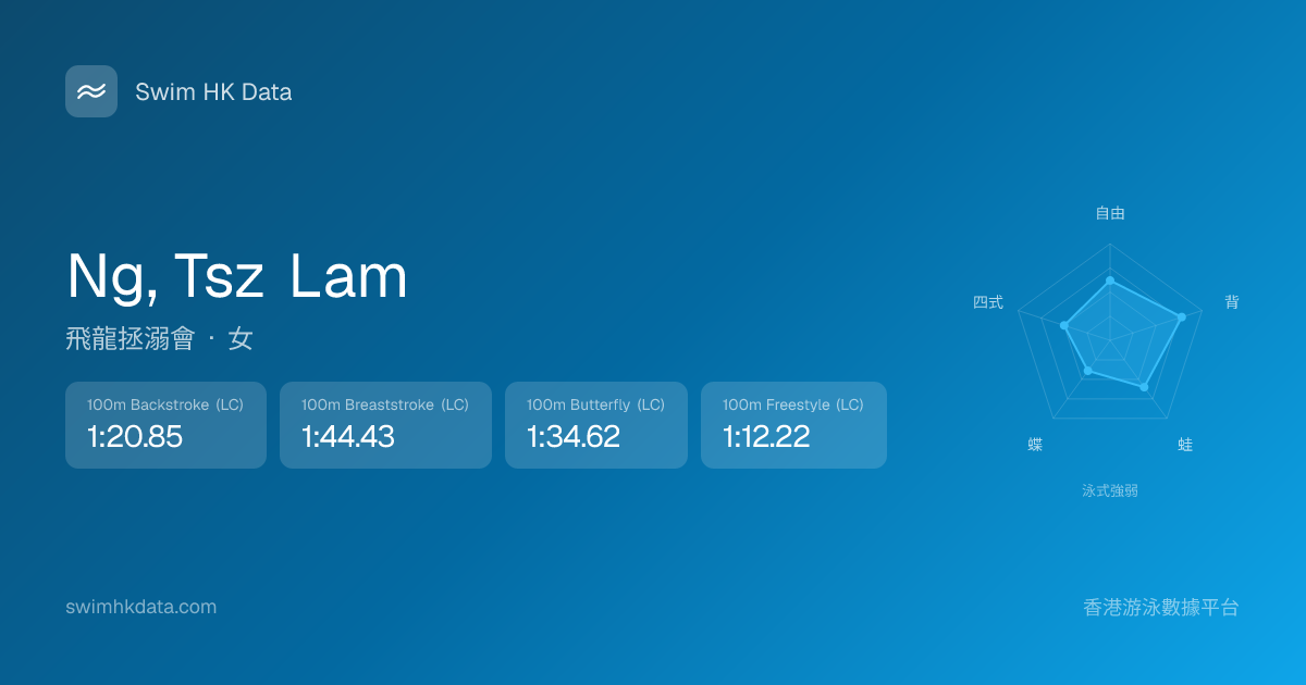 此圖表根據你所有比賽成績計算,顯示你在各泳式的相對強弱,僅供參考。繼續努力,每一次練習都會讓你更快更強!💪