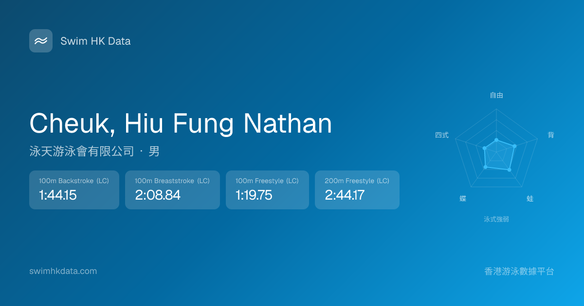 此圖表根據你所有比賽成績計算,顯示你在各泳式的相對強弱,僅供參考。繼續努力,每一次練習都會讓你更快更強!💪