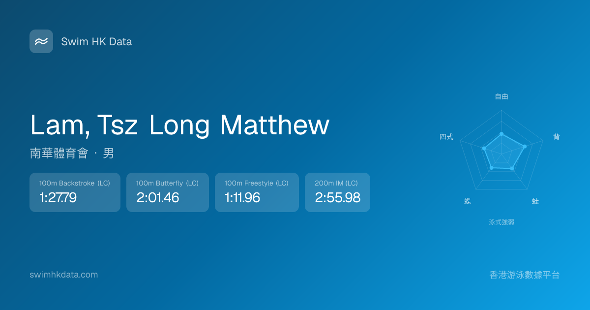 此圖表根據你所有比賽成績計算,顯示你在各泳式的相對強弱,僅供參考。繼續努力,每一次練習都會讓你更快更強!💪