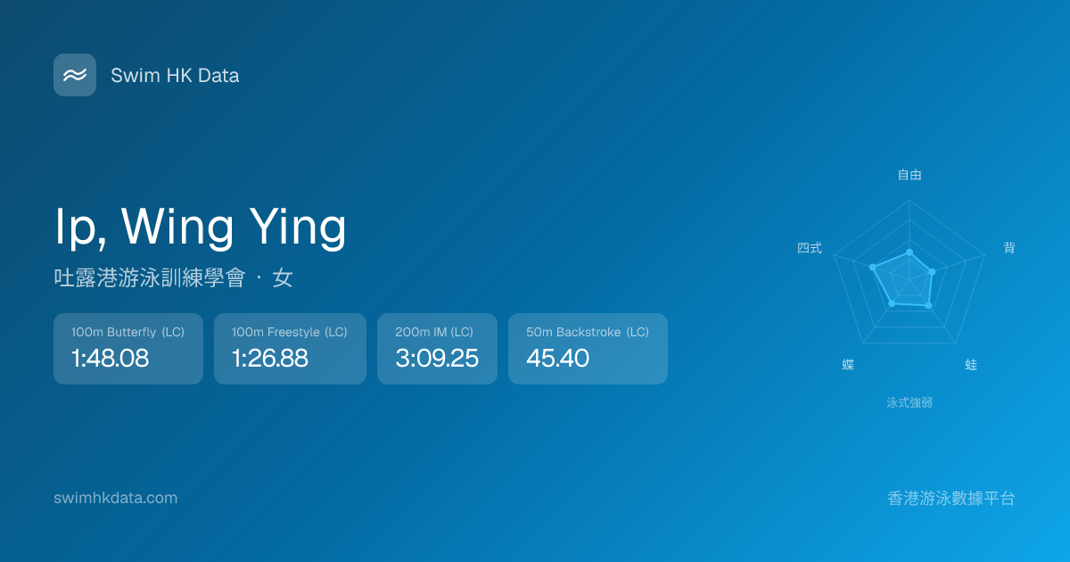 此圖表根據你所有比賽成績計算,顯示你在各泳式的相對強弱,僅供參考。繼續努力,每一次練習都會讓你更快更強!💪