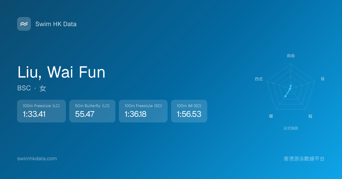 此圖表根據你所有比賽成績計算,顯示你在各泳式的相對強弱,僅供參考。繼續努力,每一次練習都會讓你更快更強!💪