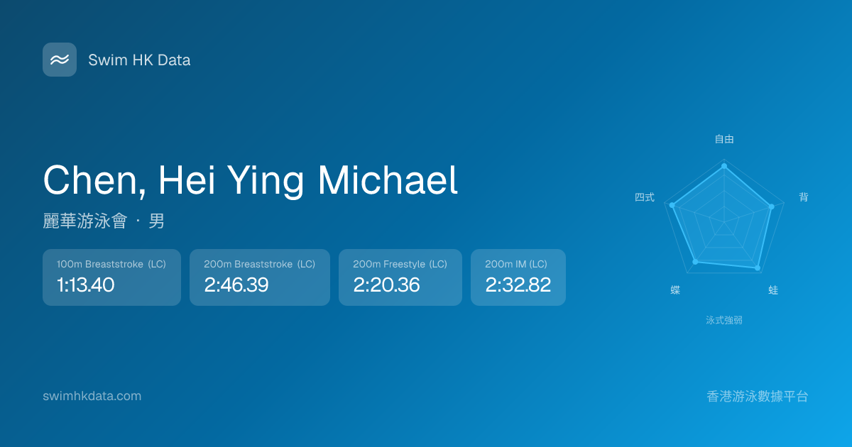 此圖表根據你所有比賽成績計算,顯示你在各泳式的相對強弱,僅供參考。繼續努力,每一次練習都會讓你更快更強!💪