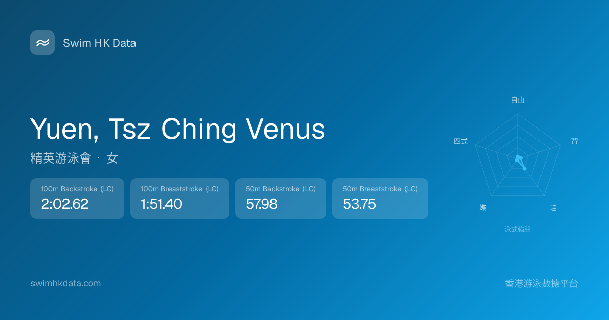 此圖表根據你所有比賽成績計算,顯示你在各泳式的相對強弱,僅供參考。繼續努力,每一次練習都會讓你更快更強!💪