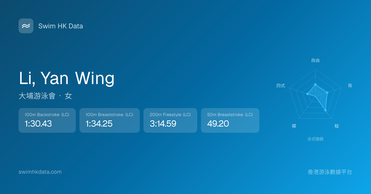此圖表根據你所有比賽成績計算,顯示你在各泳式的相對強弱,僅供參考。繼續努力,每一次練習都會讓你更快更強!💪