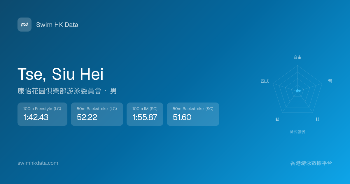 此圖表根據你所有比賽成績計算,顯示你在各泳式的相對強弱,僅供參考。繼續努力,每一次練習都會讓你更快更強!💪