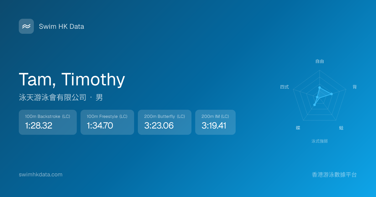 此圖表根據你所有比賽成績計算,顯示你在各泳式的相對強弱,僅供參考。繼續努力,每一次練習都會讓你更快更強!💪