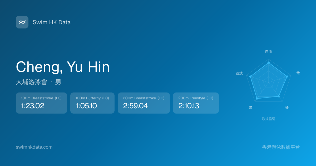 此圖表根據你所有比賽成績計算,顯示你在各泳式的相對強弱,僅供參考。繼續努力,每一次練習都會讓你更快更強!💪
