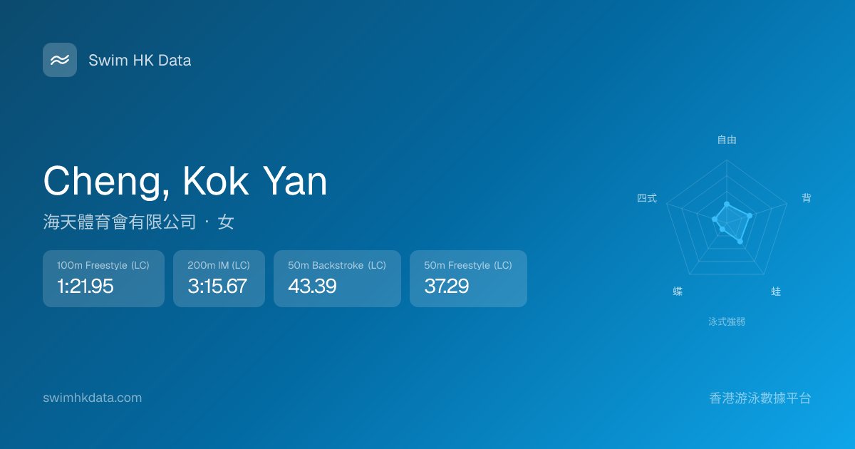 此圖表根據你所有比賽成績計算,顯示你在各泳式的相對強弱,僅供參考。繼續努力,每一次練習都會讓你更快更強!💪