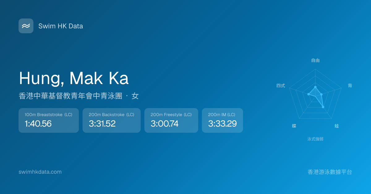 此圖表根據你所有比賽成績計算,顯示你在各泳式的相對強弱,僅供參考。繼續努力,每一次練習都會讓你更快更強!💪