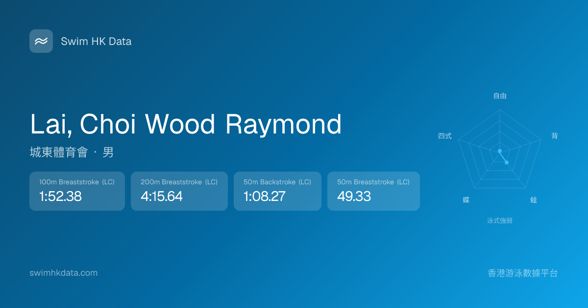 此圖表根據你所有比賽成績計算,顯示你在各泳式的相對強弱,僅供參考。繼續努力,每一次練習都會讓你更快更強!💪