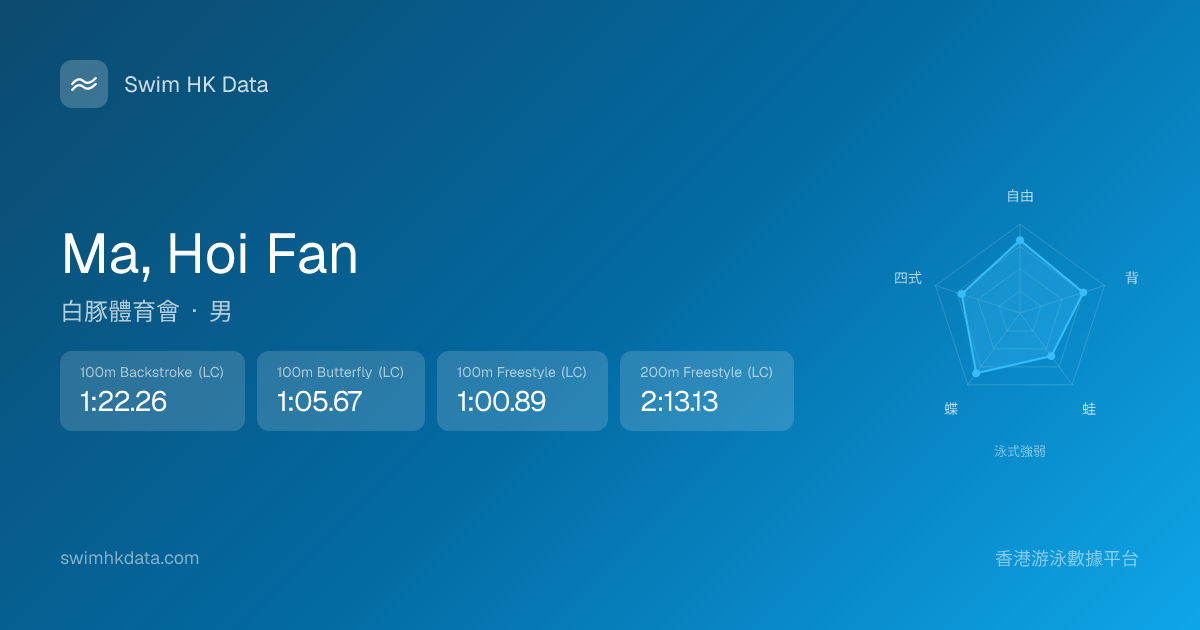 此圖表根據你所有比賽成績計算,顯示你在各泳式的相對強弱,僅供參考。繼續努力,每一次練習都會讓你更快更強!💪