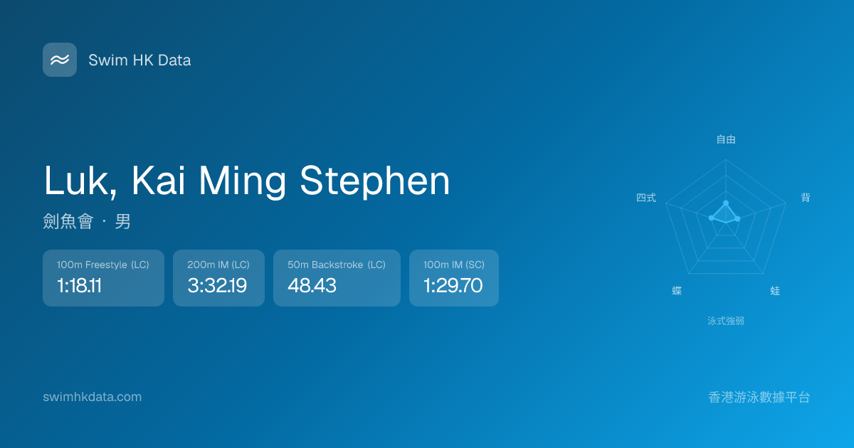 此圖表根據你所有比賽成績計算,顯示你在各泳式的相對強弱,僅供參考。繼續努力,每一次練習都會讓你更快更強!💪