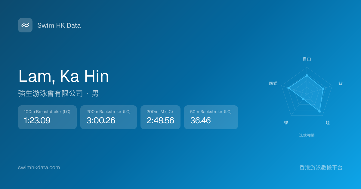此圖表根據你所有比賽成績計算,顯示你在各泳式的相對強弱,僅供參考。繼續努力,每一次練習都會讓你更快更強!💪
