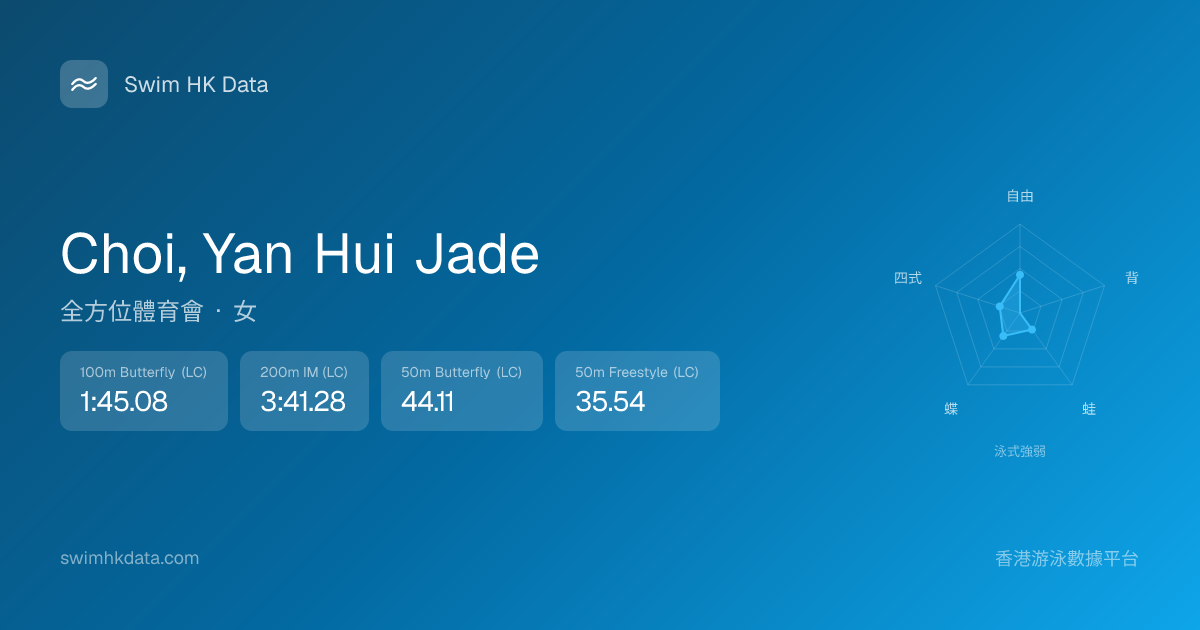 此圖表根據你所有比賽成績計算,顯示你在各泳式的相對強弱,僅供參考。繼續努力,每一次練習都會讓你更快更強!💪