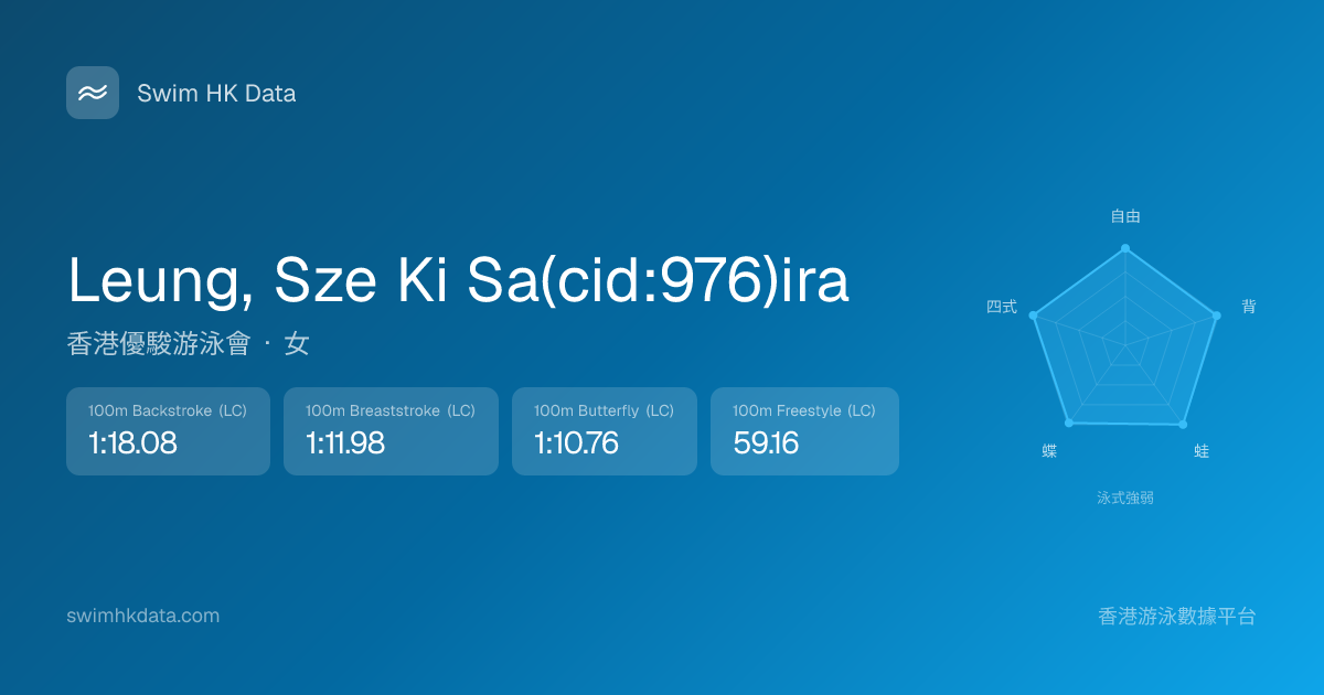 此圖表根據你所有比賽成績計算,顯示你在各泳式的相對強弱,僅供參考。繼續努力,每一次練習都會讓你更快更強!💪