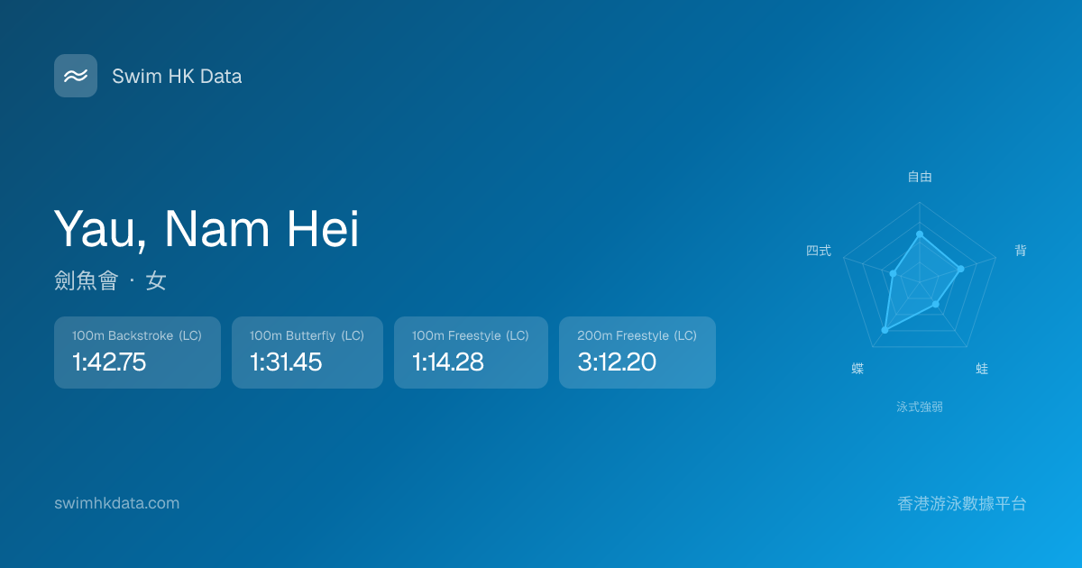 此圖表根據你所有比賽成績計算,顯示你在各泳式的相對強弱,僅供參考。繼續努力,每一次練習都會讓你更快更強!💪