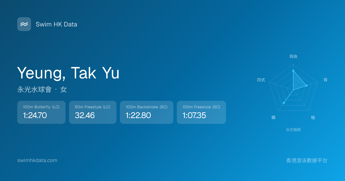 此圖表根據你所有比賽成績計算,顯示你在各泳式的相對強弱,僅供參考。繼續努力,每一次練習都會讓你更快更強!💪