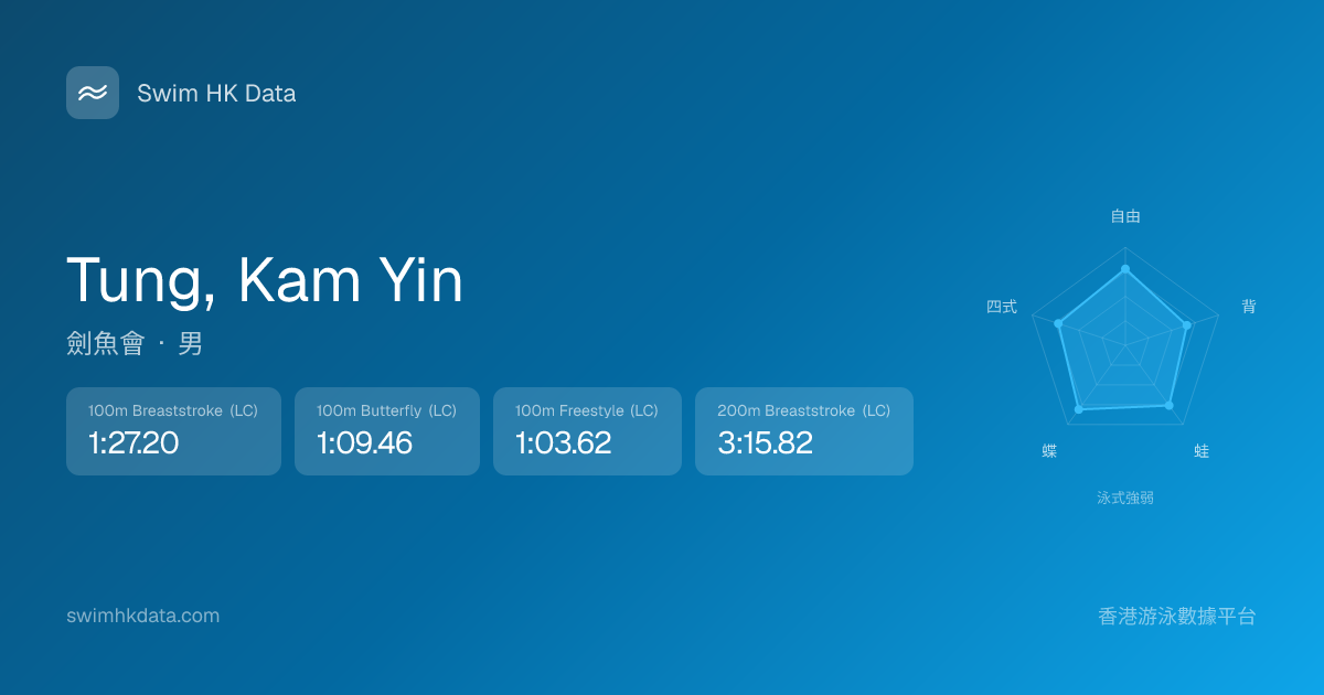 此圖表根據你所有比賽成績計算,顯示你在各泳式的相對強弱,僅供參考。繼續努力,每一次練習都會讓你更快更強!💪