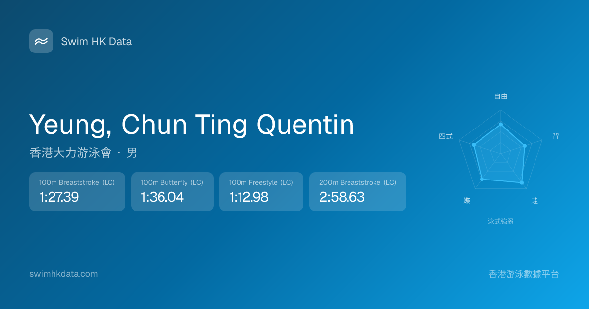 此圖表根據你所有比賽成績計算,顯示你在各泳式的相對強弱,僅供參考。繼續努力,每一次練習都會讓你更快更強!💪