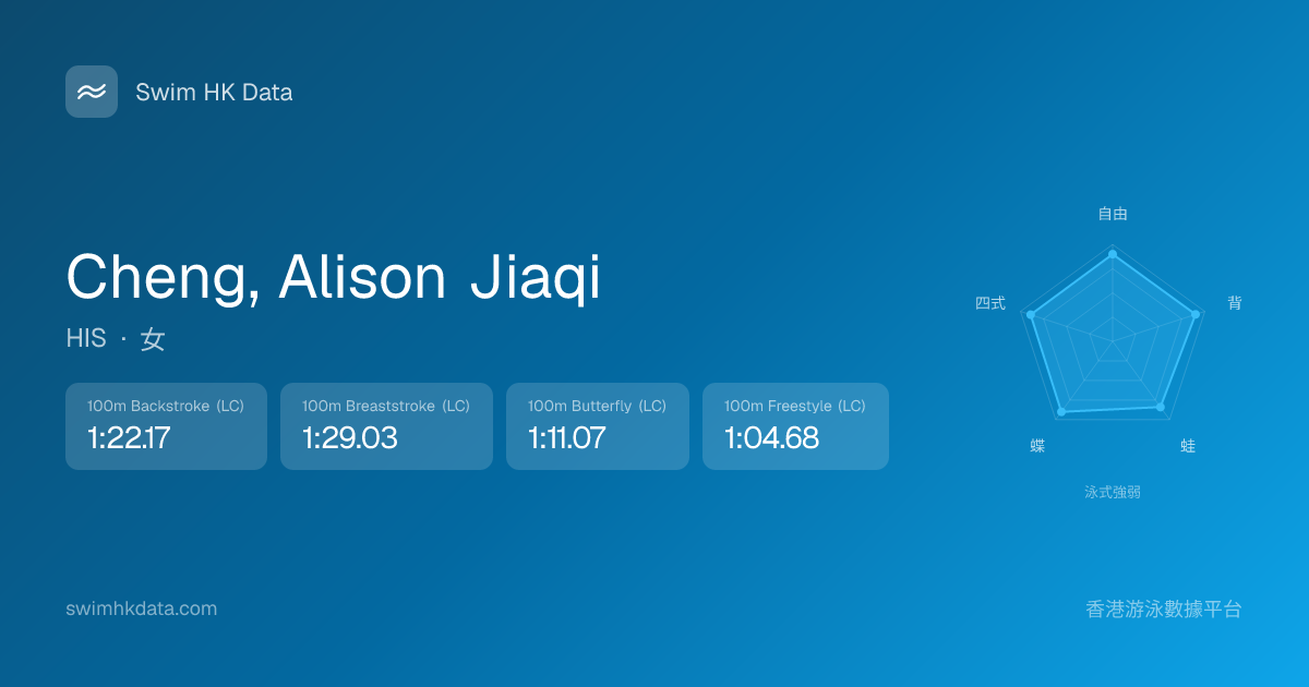 此圖表根據你所有比賽成績計算,顯示你在各泳式的相對強弱,僅供參考。繼續努力,每一次練習都會讓你更快更強!💪