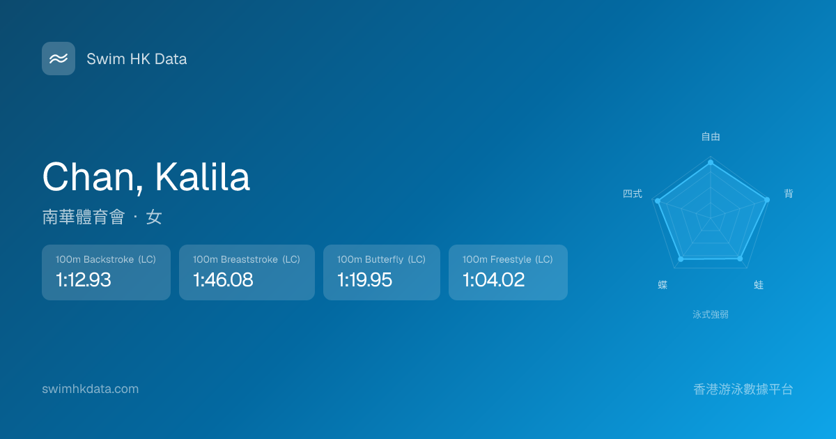 此圖表根據你所有比賽成績計算,顯示你在各泳式的相對強弱,僅供參考。繼續努力,每一次練習都會讓你更快更強!💪