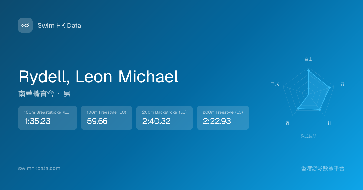 此圖表根據你所有比賽成績計算,顯示你在各泳式的相對強弱,僅供參考。繼續努力,每一次練習都會讓你更快更強!💪