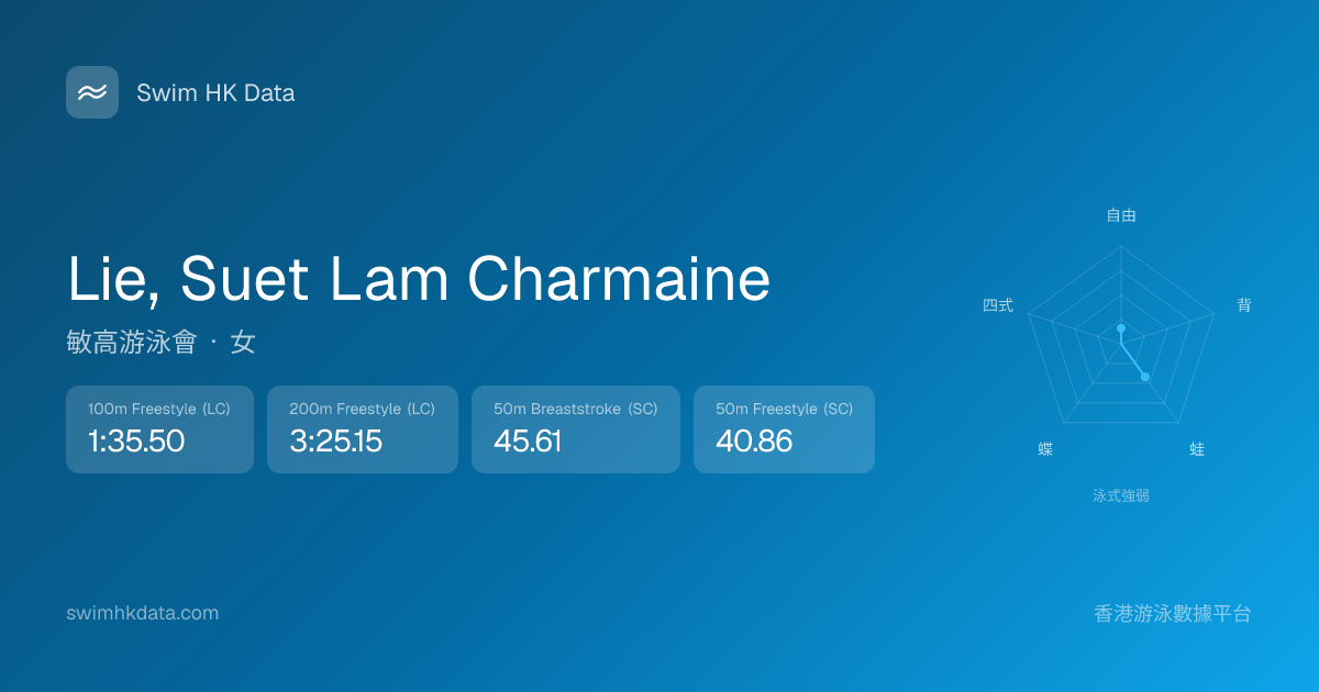 此圖表根據你所有比賽成績計算,顯示你在各泳式的相對強弱,僅供參考。繼續努力,每一次練習都會讓你更快更強!💪
