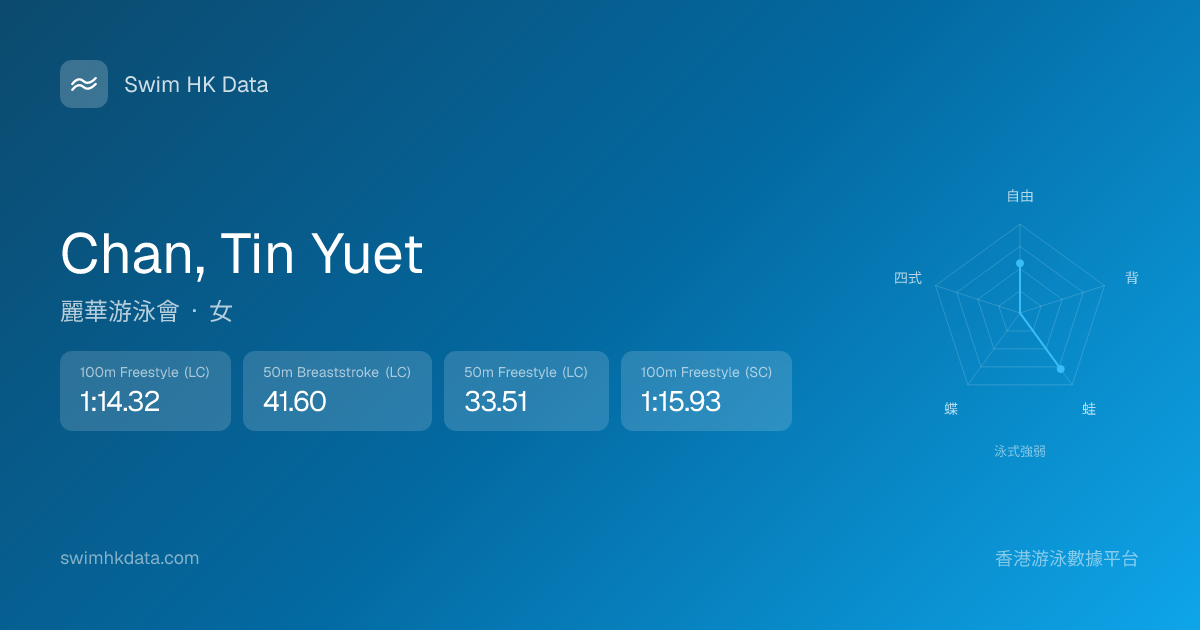此圖表根據你所有比賽成績計算,顯示你在各泳式的相對強弱,僅供參考。繼續努力,每一次練習都會讓你更快更強!💪