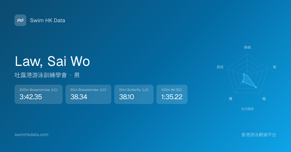 此圖表根據你所有比賽成績計算,顯示你在各泳式的相對強弱,僅供參考。繼續努力,每一次練習都會讓你更快更強!💪