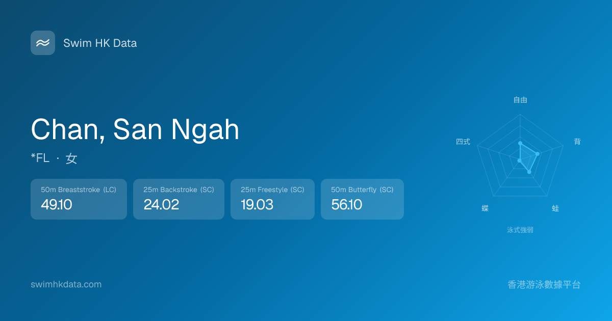 此圖表根據你所有比賽成績計算,顯示你在各泳式的相對強弱,僅供參考。繼續努力,每一次練習都會讓你更快更強!💪