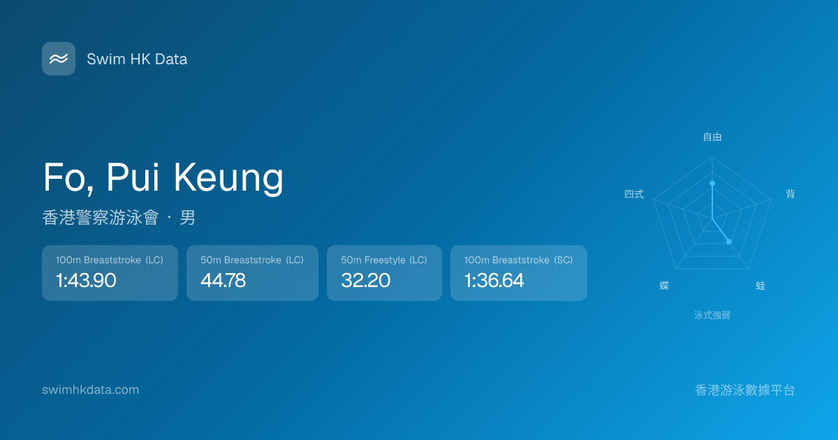 此圖表根據你所有比賽成績計算,顯示你在各泳式的相對強弱,僅供參考。繼續努力,每一次練習都會讓你更快更強!💪