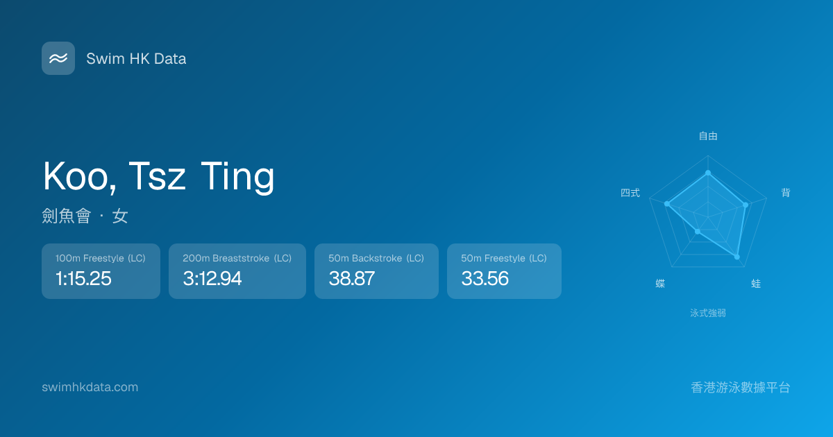 此圖表根據你所有比賽成績計算,顯示你在各泳式的相對強弱,僅供參考。繼續努力,每一次練習都會讓你更快更強!💪