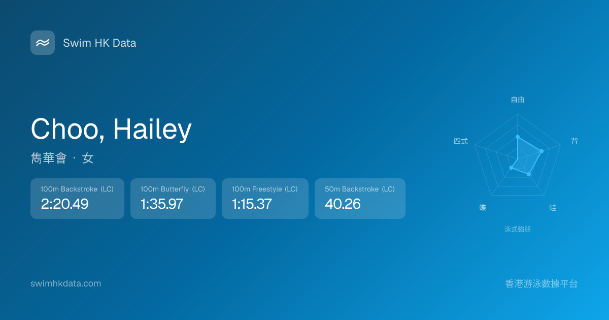 此圖表根據你所有比賽成績計算,顯示你在各泳式的相對強弱,僅供參考。繼續努力,每一次練習都會讓你更快更強!💪