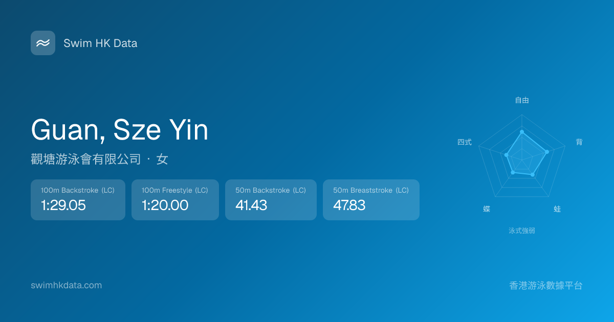 此圖表根據你所有比賽成績計算,顯示你在各泳式的相對強弱,僅供參考。繼續努力,每一次練習都會讓你更快更強!💪