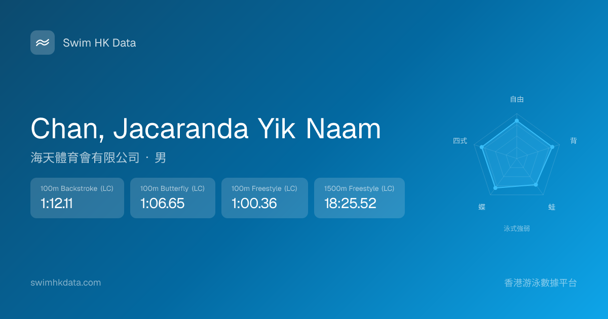 此圖表根據你所有比賽成績計算,顯示你在各泳式的相對強弱,僅供參考。繼續努力,每一次練習都會讓你更快更強!💪