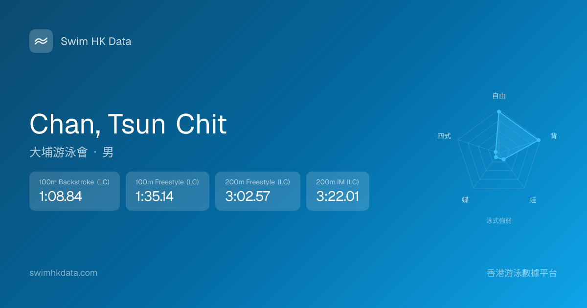 此圖表根據你所有比賽成績計算,顯示你在各泳式的相對強弱,僅供參考。繼續努力,每一次練習都會讓你更快更強!💪