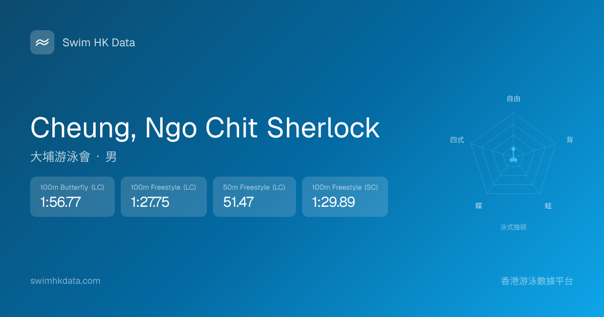 此圖表根據你所有比賽成績計算,顯示你在各泳式的相對強弱,僅供參考。繼續努力,每一次練習都會讓你更快更強!💪