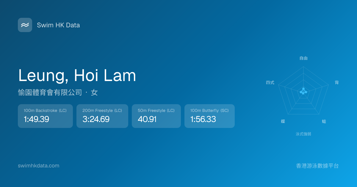 此圖表根據你所有比賽成績計算,顯示你在各泳式的相對強弱,僅供參考。繼續努力,每一次練習都會讓你更快更強!💪